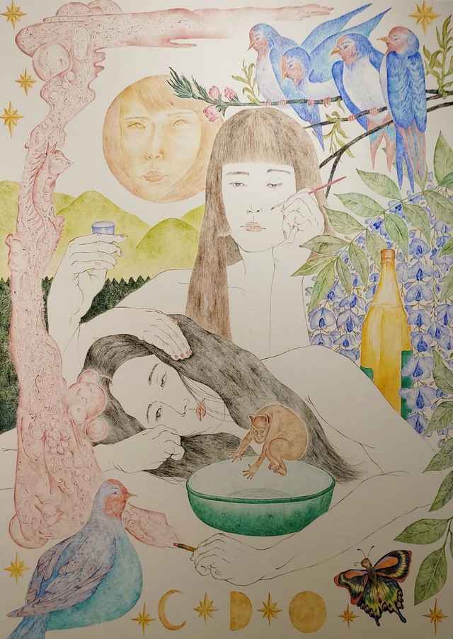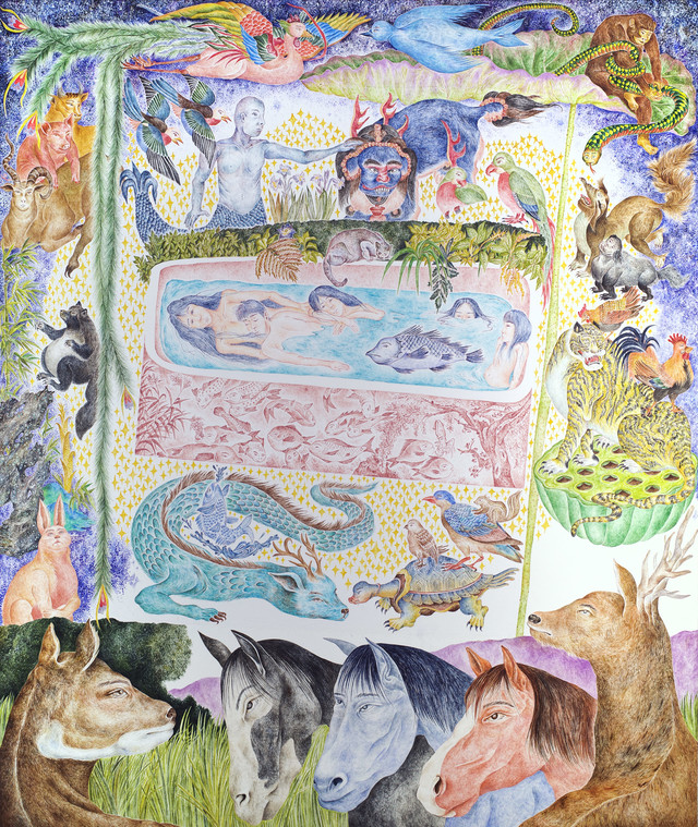 Kim transforms bodily sensations, memories, and emotions—those that cannot be fully articulated in words—into images composed of various forms. Drawing upon idioms or specific emotional states, she applies them directly onto her pictorial surface. At times, she populates her work with animals possessing human eyes—hybrids that are half-human, half-beast, or creatures whose heightened senses surpass those of humans. By presenting these beings as narrators, Kim delivers human stories through metaphors that are simultaneously strange and direct. The combination of animals and human traits—something impossible in reality—becomes a liberated visual language uniquely her own. Through these hybrid beings, Kim observes occurrences within and outside her own body and expresses them through imagery. In works such as The Bath of the Twelve Zodiacs and The Feast of Flowers and Birds, she draws inspiration from Eastern mythology, creating scenes that evoke an atmosphere of mysterious storytelling.