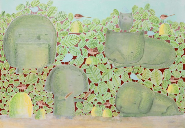2010년대 초중반의 작업에서 '정원'은 누군가의 부재를 품은 채 여전히 자라는 세계로 그려집니다. 화면을 가득 채운 녹색의 큰 화면에 원추형 나무와 소박한 조경, 곳곳에 놓인 장난감과 소품은 정원을 단순한 풍경이 아니라 기억의 무대로 바꿔놓았습니다. 이 시기에 작가의 분신처럼 보이는 '아이'와 '개'의 도상이 본격적으로 등장합니다. 포옹과 손짓, 몸을 기대는 제스쳐가 화면의 정조를 결정하고, 관람자는 그들의 속도로 정원을 거닐게 됩니다. 이 시기 박형진의 회화는 감정의 미세한 결을 물성으로 밀착시키는 방식(색면의 겹침, 붓결의 진폭, 캐릭터의 시선)으로 무르익습니다. 연속된 개인전을 거쳐 도상이 더욱 정제된 박형진의 작업은 캐릭터와 식물의 형태는 단단해지고 크기, 비례의 왜곡과 평면 분할이 보다 명료한 장치로 공고화됩니다. 화면은 보다 간결해졌지만, 색면과 질감의 대비가 앞선 시기의 서정과 유머를 균형 있게 품어내어 이야기의 밀도를 높이되 서술은 절제하는 방식을 통해 일상과 동화의 경계를 더욱 형식적으로 다지는 시기라고 볼 수 있습니다.