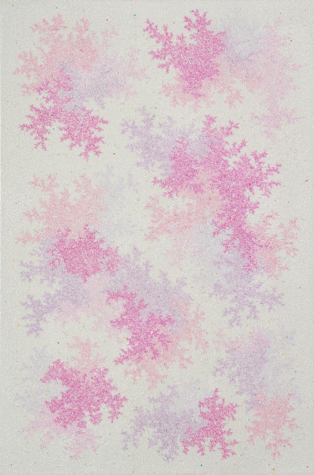 초기에는 손, 나뭇잎, 세포 조직 등 구체적 형상을 통해 세계를 들여다보는 ‘확대된 시선’을 표현했고, 점차 대상의 외곽을 지우고 레이어를 쌓으며 추상적 형태와 우주의 구조를 화면 위에 구현해 왔다. 작가는 다양한 회화적 시도를 통해 화면 위에 깊이와 흐름을 동시에 부여하는데, 아크릴, 연필, 코팅, 유리구슬 등 재료 간의 결합을 통해 생명체의 내면처럼 다층적인 조형 세계를 구축한다.
