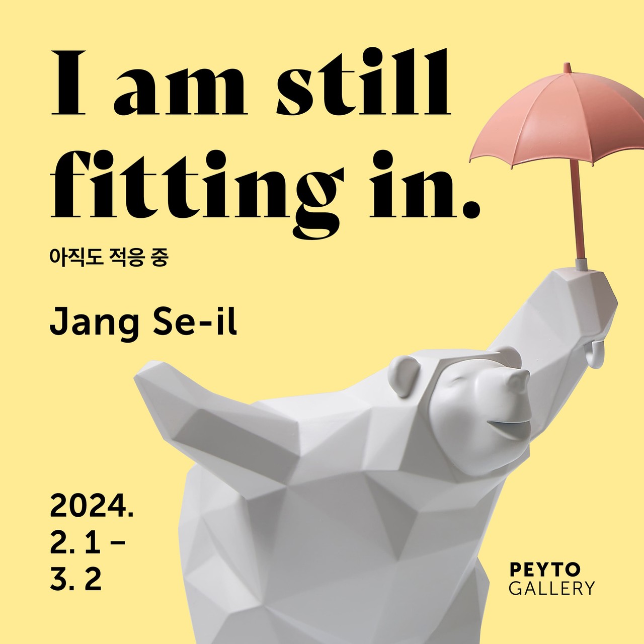 《I am Still Fitting In : 적응 중》 展은 작가적 상상력을 바탕으로 동물의 형태를 빌어 도시환경에 맞게 변화하는 현대인의 모습을 직각 도형을 통해 조형적으로 풀어내는 장세일 작가의 작업을 소개한다.