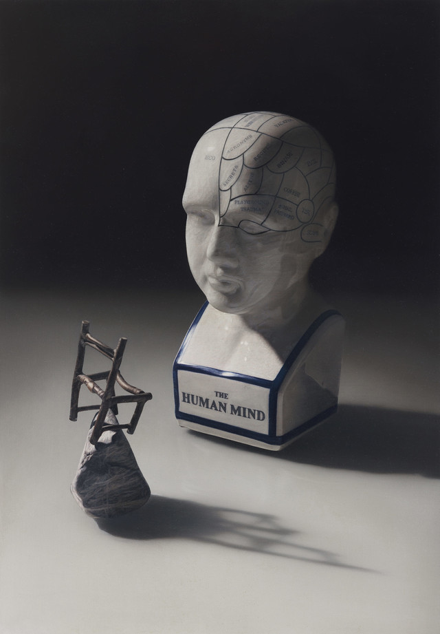 지석철은 부재의 서사(Narrative)를 탐구하기 위해 작가의 상징이라고 할 수 있는 소파 쿠션의 등받이 부분과 미니 의자를 화면에 반복적으로 등장시킨다. 탁월한 묘사력으로 극사실적으로 그려낸 작업은 사실에 근거한 이미지에서 출발하여 오브제로의 전환과 입체(설치)작업의 경험이 복합적으로 변주한 개념적 이미지이다. 거대한 자연 혹은 인간이 만든 건축물과 대비되는 미니 의자는 부재의 상징으로 의자는 작품의 주인공이자 동시에 존재를 위한 부차적 도구로 갈망, 그리움, 서정성을 담는 주제이다. 작업을 관통하는 ‘부재’라는 키워드는 ‘그 곳에 존재했었음’을 전제로 한다. 의자는 작가 자신일 수도, 삶에 지친 현대인 일 수도 있다. 존재의 표상인 의자를 통해 현대인과 상실감과 고독, 불안의 정서를 대변하고 시대의 상실과 아픔을 은유적으로 표현한다.